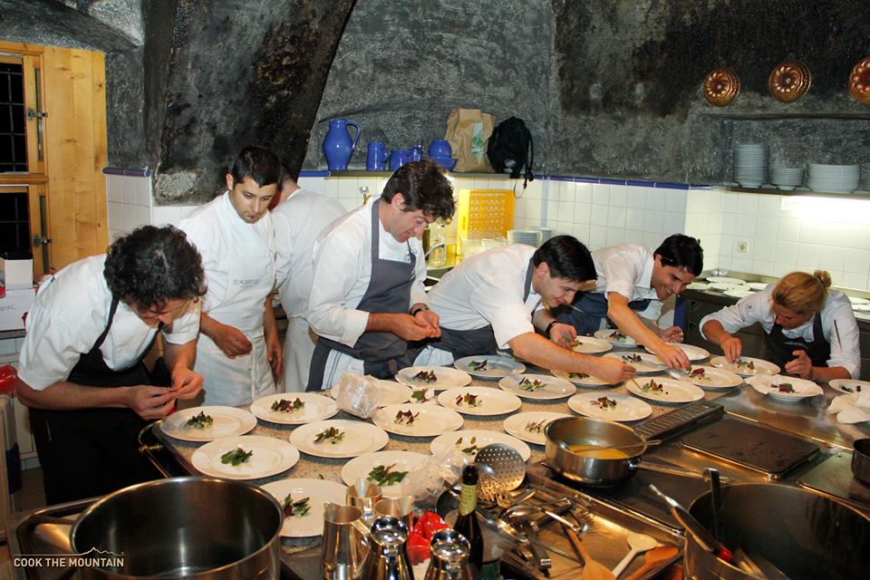 A cozinha fica aberta para o salão principal onde se vê uma grande equipe, num trabalho bem organizado.