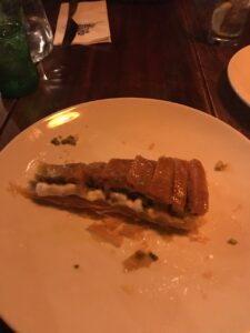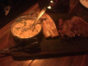O serviço é extremamente performático. Boa parte dos pratos são finalizados à mesa com uma teatralidade divertida que entretém os visitantes. Pedi a costela, cujo preparo especial leva cerca de oito horas ao forno. O resultado é uma carne extremamente macia e saborosa.