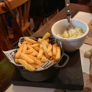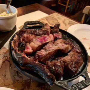 O cardápio têm entradas diversas e muito gostosas – um dos carros chefes da casa é a provoleta, mas as possibilidades são inúmeras. Meu prato principal foi um chuletón maturado a seco (dry-aged, uma das especialidades da casa), o que dá um sabor especial a carne, que já é de ótima qualidade.
