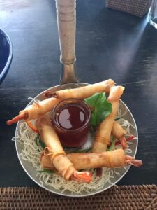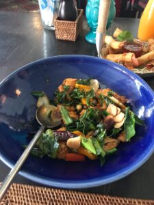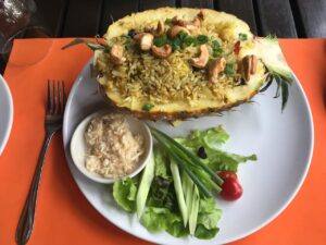 Como entrada, pedi os rolinhos primavera com camarões crocantes. Como prato principal, provei o abacaxi recheado com arroz refogado de frango, salsichas chinesas, e castanha de caju acompanhado de omelete tailandesa e carne de porco desfiada. Também gostei do refogado de frango com castanha de caju, pimentões e cogumelos. Pratos harmoniosos, com execução tradicional e muito saborosos.